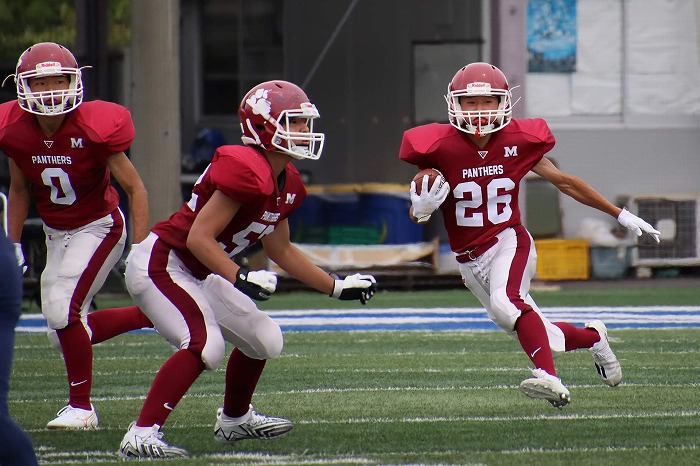 試合は立ち上がりからディフェンスがしっかり守り、オフェンスに攻撃権を回してくれ良い流れができました。オフェンスは最初のシリーズでテンポ良くパスが決まり先制点を得ることができました。第2クォーターに入ってもディフェンスが奮闘してくれ、それがオフェンスの良いリズムにつながり、ダウンを更新しながら2本目のタッチダウンを奪うことができました。前半終了間際にタッチダウンを奪われ、13−7で折り返しますが、後半に入っても本校チームのオフェンスのリズムは変わらず、3本のタッチダウンを得ることができ、33−7で初優勝を飾ることができました。