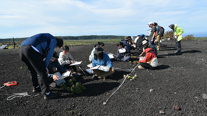 その後は1986年噴火の溶岩流跡で植生調査を実施。班ごとに区画を設定し、植物の種類や被度、落葉層や土壌動物の有無を調べることで、自然の回復過程を学びました。さらに「再生の一本道」では、火山草原から低木林、混交林へと進む植生の遷移を比較し、自然が時間をかけて再生していく姿を“目で見る”ことができました。