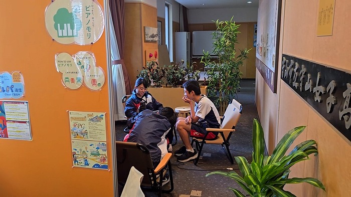 ピアノモリは、ピアノのすぐそばにある木々に囲まれた小さな空間です。一人でゆっくりしたり、少人数で話したりするのにぴったりの場所です。学校の中で「ひとりでも恥ずかしくない」「安心して過ごせる」空間は意外と少ないもの。ピアノモリは、そんな思いから生まれた、もうひとつの“ほっとできる居場所”です。