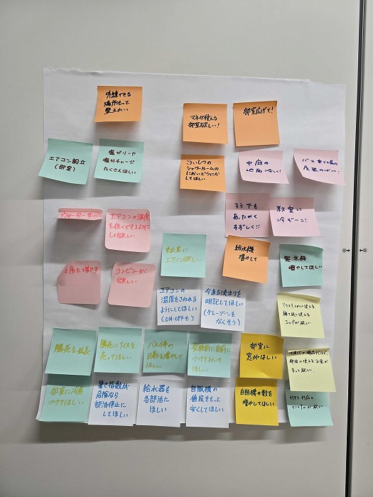 ワークショップでは、部活動中の安全に関する疑問や不安を書き出し、具体的な改善アイデアを出し合いました。「氷が足りない」「給水機を増やしてほしい」「体育館や部室のエアコンをもっと使えるようにしてほしい」「暑さ指数が危険なら部活を停止してほしい」「落雷警報をランプなどで分かりやすくしてほしい」など、生徒の実感に基づいた意見が多く挙がりました。