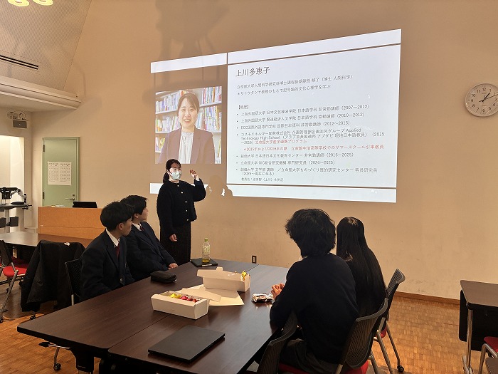 当日は、日本語教育・文化心理学・質的研究を専門とする上川多恵子先生(創価大学文学部講師/立命館大学客員研究員)を講師に迎え、「TEM(複線径路等至性モデリング)」という研究手法を用いて振り返りを行いました。TEMは、経験を時系列で整理しながら、葛藤や分岐点、行動の変化を可視化することができる手法であり、今後、探究学習における振り返りへの活用も期待されています。