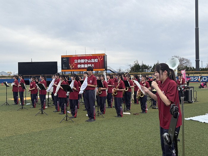 4月5日(日)カローラ滋賀はちまんスタジアムにて、カローラフェスタが開催され、高校吹奏楽部がミニコンサートを実施いたしました。今年度は、参加者の方に指揮をしていただいたり、演奏する曲順のくじを引いていただいたりと、会場の皆様と一緒にステージを作り上げることができました。ご来場いただいた多くの方々と音楽を通して楽しい時間を過ごすことができ、大変嬉しく思います。今回このような演奏の機会を与えてくださった皆様に部員一同感謝申し上げます。
