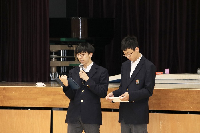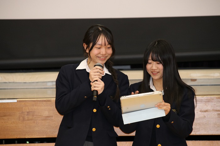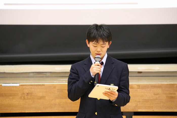 今回は、高校2年生のFTコース代議員が司会を務め、今年度FTコースを担当する教員からの挨拶に続いて、各学年の代表生徒より現在のクラスの様子や取り組みについて報告を行いました。